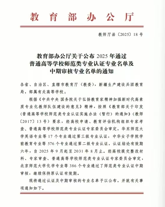 近日,教育部办公厅正式发布《教育部办公厅关于公布2025年通过普通高等学校师范类专业认证专业名单及中期审核专业名单的通知》(教师厅函〔2025〕18号)。我系生物科学专业通过师范类专业认证第二级认证(有条件通过),认证有效期(有效期6年,自2025年9月起至2031年8月止)。