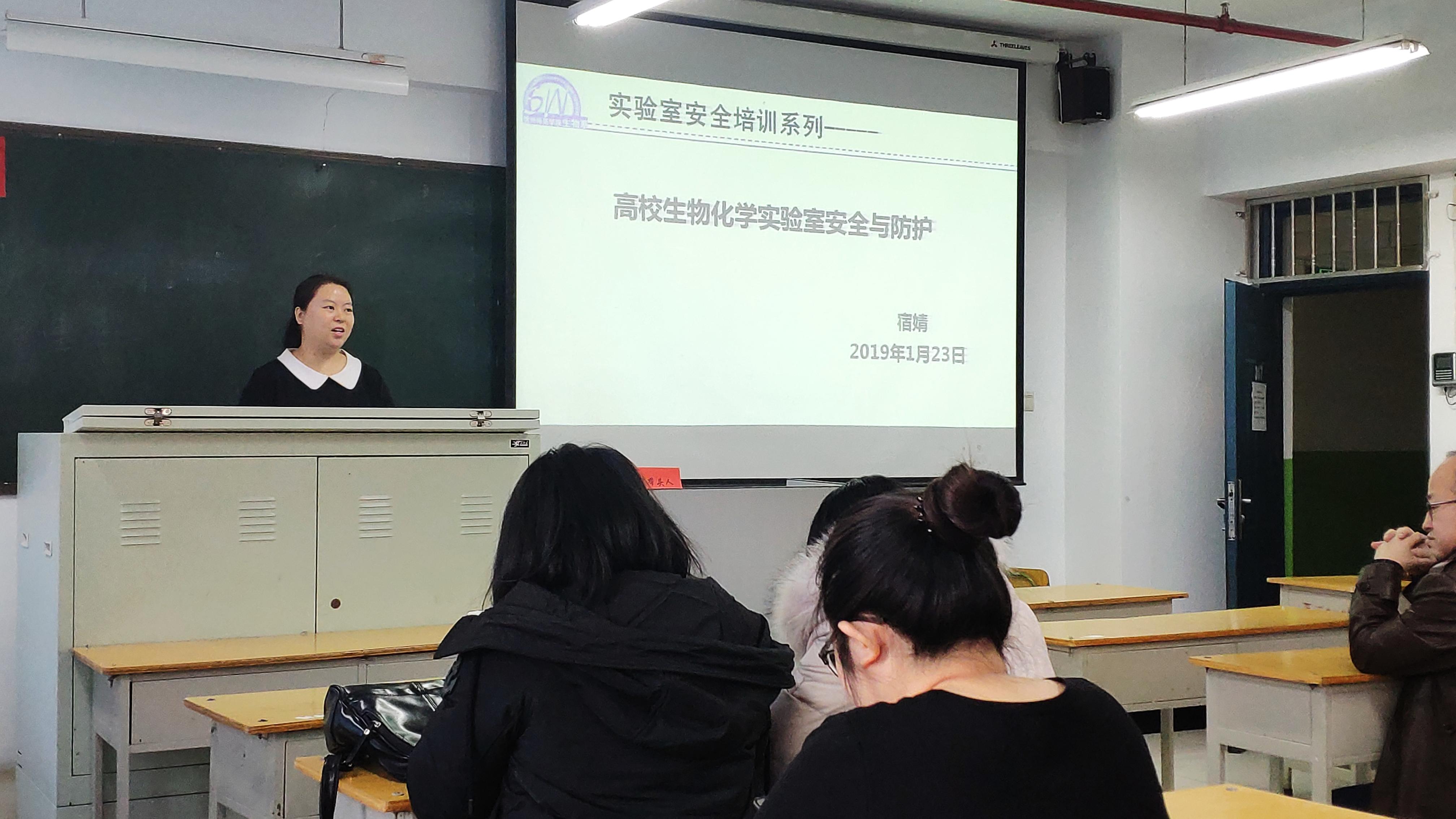1月23日,宿婧老师在系内面向全系教职工进行了实验室安全培训---《高校生物化学实验室安全与防护》。本次培训主要针对实验室安全的重要性、生物实验室安全常识、生物安全与防护等方面做了详细讲解,并解读了我系现有的实验室规章制度;同时对下一步的工作重点进行了规划,要根据学科特点实行实验室安全准入制度,进一步组织开展实验室危险化学品专项培训和应急演练。