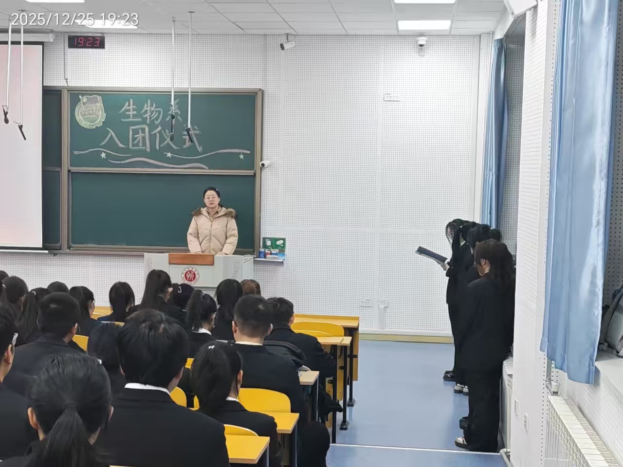 为弘扬五四精神,凝聚青年力量,增强团员的荣誉感与使命感,12月25日晚,忻州师范学院生物系于明理楼1-4隆重举行新团员入团仪式。生物系党总支副书记史晓晶老师、团委书记彭一老师、辅导员张凯权老师与新团员共同见证了这一庄严时刻。